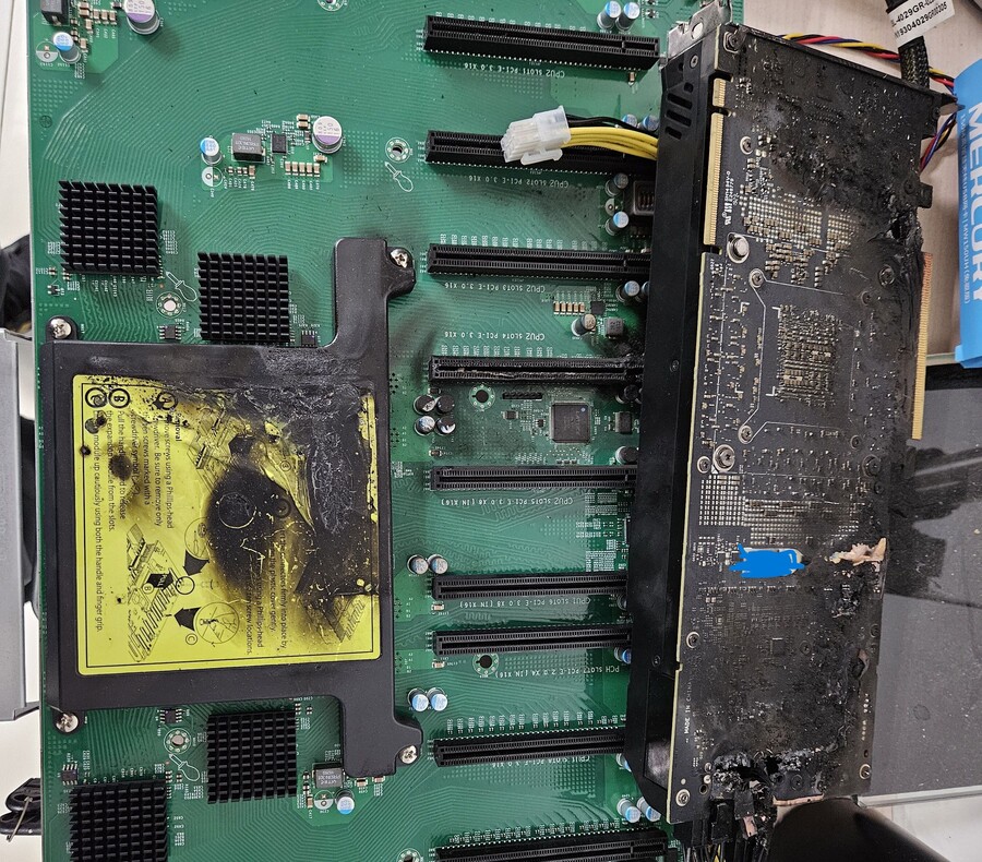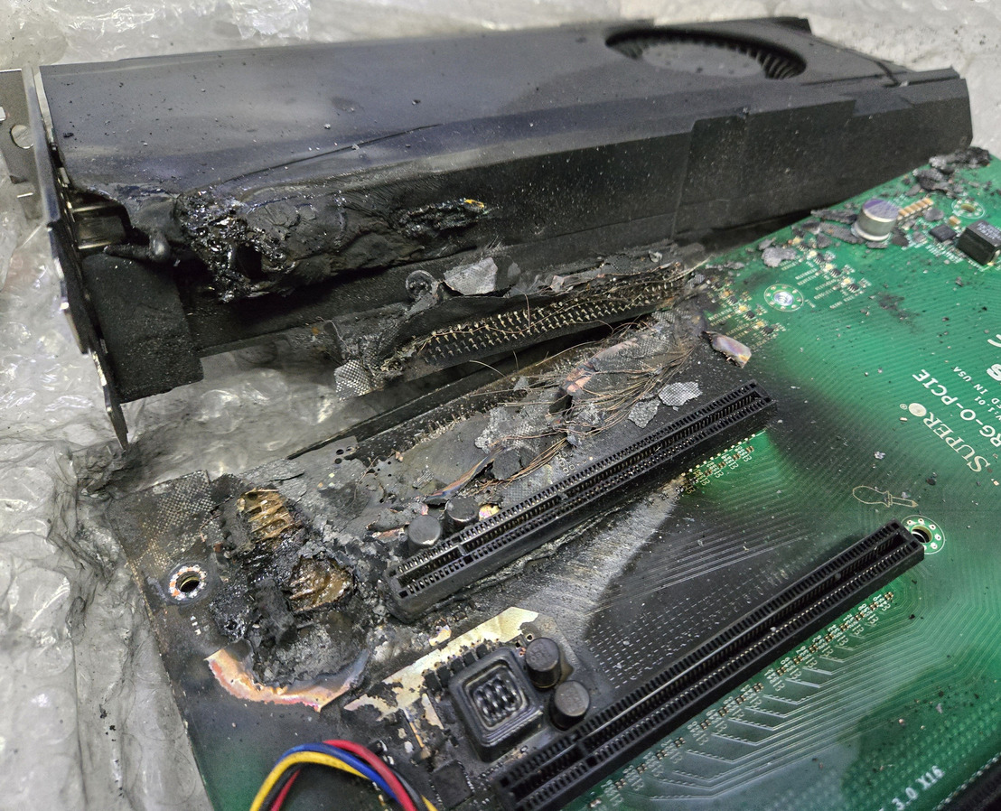 最近几年前的 2080Ti 在物理上运行了 gpu-burn,这里放点图。一共有两台机器,看起来一台是主板烧到显卡的,另一台就看不出来了,似乎是供电烧了。