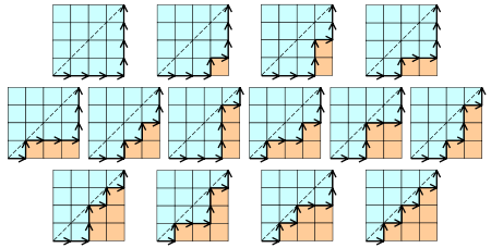 在一个平面直角坐标系中,只能往右或往上走一个单位长度,问有多少种不同的路径可以从左下角 $(1, 1)$ 走到右上角 $(n, n)$,并且要求路径不能经过直线 $y = x$ 上方的点,下图中的路径都是合法的(图片来源 Wikipedia)