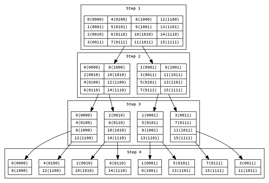 现在将整个二进制位反转,例如 0010 就变成 0100,这时候每次在同一组的数字,反转后的二进制位前几位都是相同的,这似乎十分类似加法,相邻两组二进制位反转之后数字会是连续的一段区间。例如在 Step3 中,1、5、9、13 这一组,反转二进制后是 1(1000)、5(1010)、9(1001)、13(1011),分组后是 1(1000)、9(1001) 和 5(1010)、13(1011)