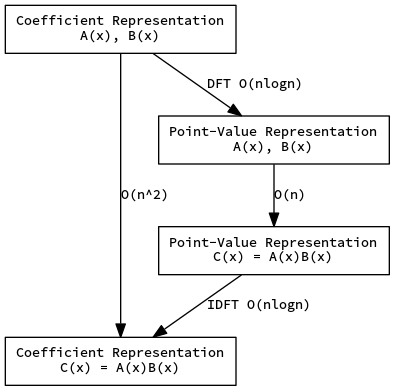 快速傅里叶变换你可以认为有两个部分,DFT 和 IDFT,分别可以在 $\mathcal O(n\log n)$ 的时间内将多项式的系数表示转化成点值表示,并且转回来,就像下面这张图所示