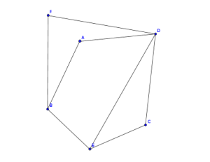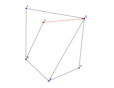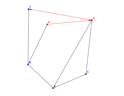 然后现在到了 $D$ 点,从 $D$ 点出发的边按照极角序排序后是 $\vec{DF}$,$\vec{DA}$,$\vec{DE}$,$\vec{DC}$,那么 $\vec{DA}$ 的前一条边就是 $\vec{DF}$,现在就从这条边走,到了 $F$ 点