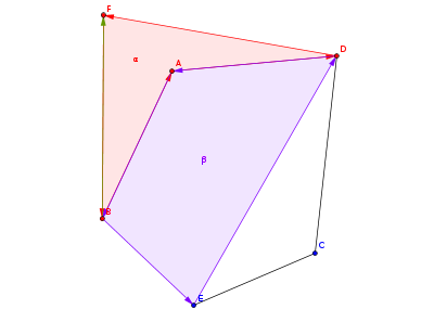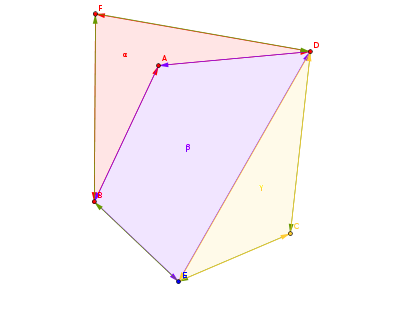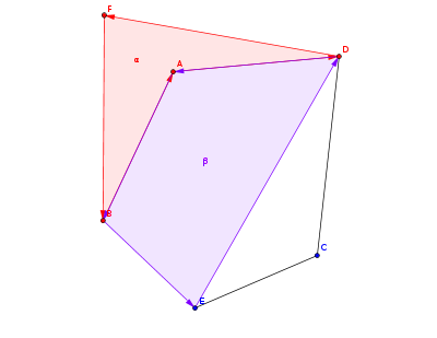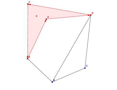 现在发现下一条边是 $\vec{AD}$,因为这条边已经标记过了,所以我们就找到了一个区域 $\alpha$,那么记录下刚刚的所有边 $\vec{AD}$,$\vec{DF}$,$\vec{FB}$,$\vec{BA}$,它们都属于 $\alpha$,并且是逆时针围成的 $\alpha$