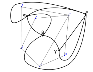 接下来 $A$ 点出发的边还有一条 $\vec{AB}$ 没有标记过(注意 $\vec{AB}$ 和 $\vec{BA}$ 不同),顺着 $\vec{AB}$ 不断寻找,可以得到区域 $\beta$