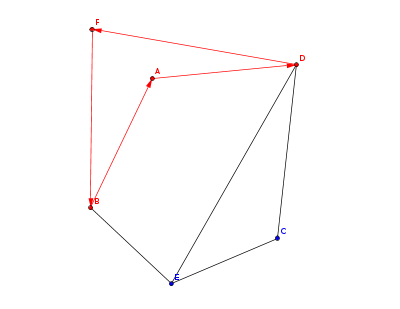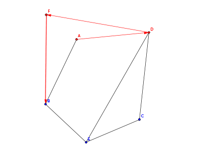 同样的,从 $F$ 出发的边按照极角序是 $\vec{FB}$, $\vec{FD}$,那么 $\vec{FD}$ 前一条边就是 $\vec{FB}$ 了,现在走这条边到了 $B$ 点
