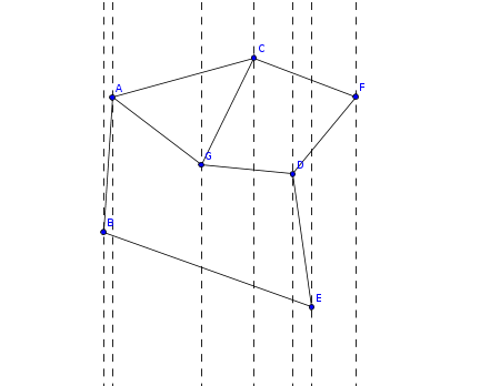 我们把顶点称为关键点,在两个关键点之间没有别的顶点,注意到不论如何移动直线,只要在两个关键点之间,这条直线和边交点的顺序不会改变。就像下面这样,两条直线之间线段可以排序
