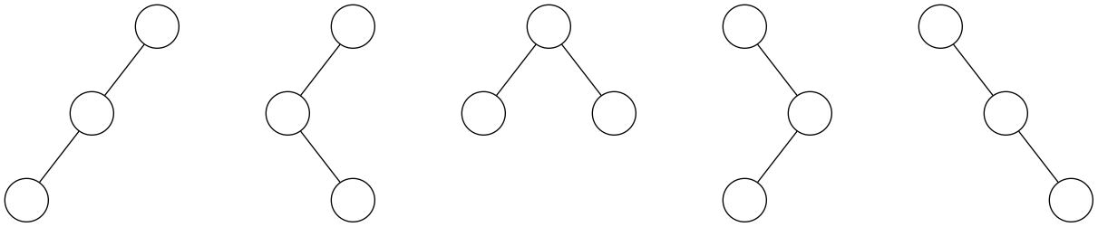 例如一个含有 3 个节点的二叉树,一共有 5 种情况,期望的叶子节点个数是 $\frac{6}{5}$